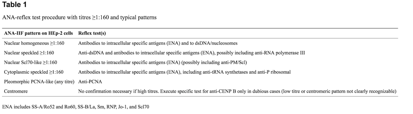 - Tonutti E, Bizzaro N, Morozzi G, et al. The ANA-reflex test as a model for improving clinical appropriateness in autoimmune diagnostics. Auto Immun Highlights. 2016;7(1)doi:10.1007/s13317-016-0080-3