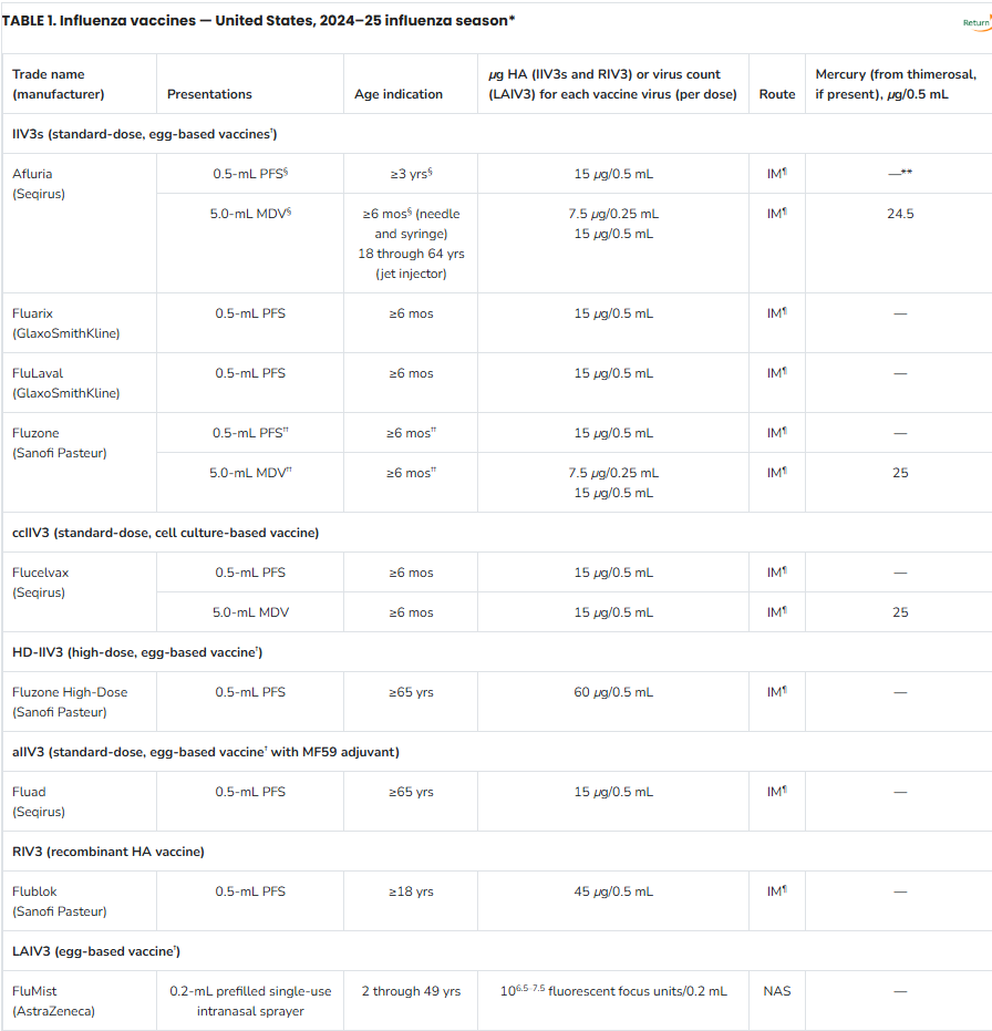Abbreviations: ACIP = Advisory Committee on Immunization Practices; aIIV3 = adjuvanted inactivated influenza vaccine, trivalent; ccIIV3 = cell culture-based inactivated influenza vaccine, trivalent; HA = hemagglutinin; HD-IIV3 = high-dose inactivated influenza vaccine, trivalent; IIV3 = inactivated influenza vaccine, trivalent; IM = intramuscular; LAIV3 = live attenuated influenza vaccine, trivalent; MDV = multidose vial; NAS = intranasal; PFS = prefilled syringe; RIV3 = recombinant influenza vaccine, trivalent.