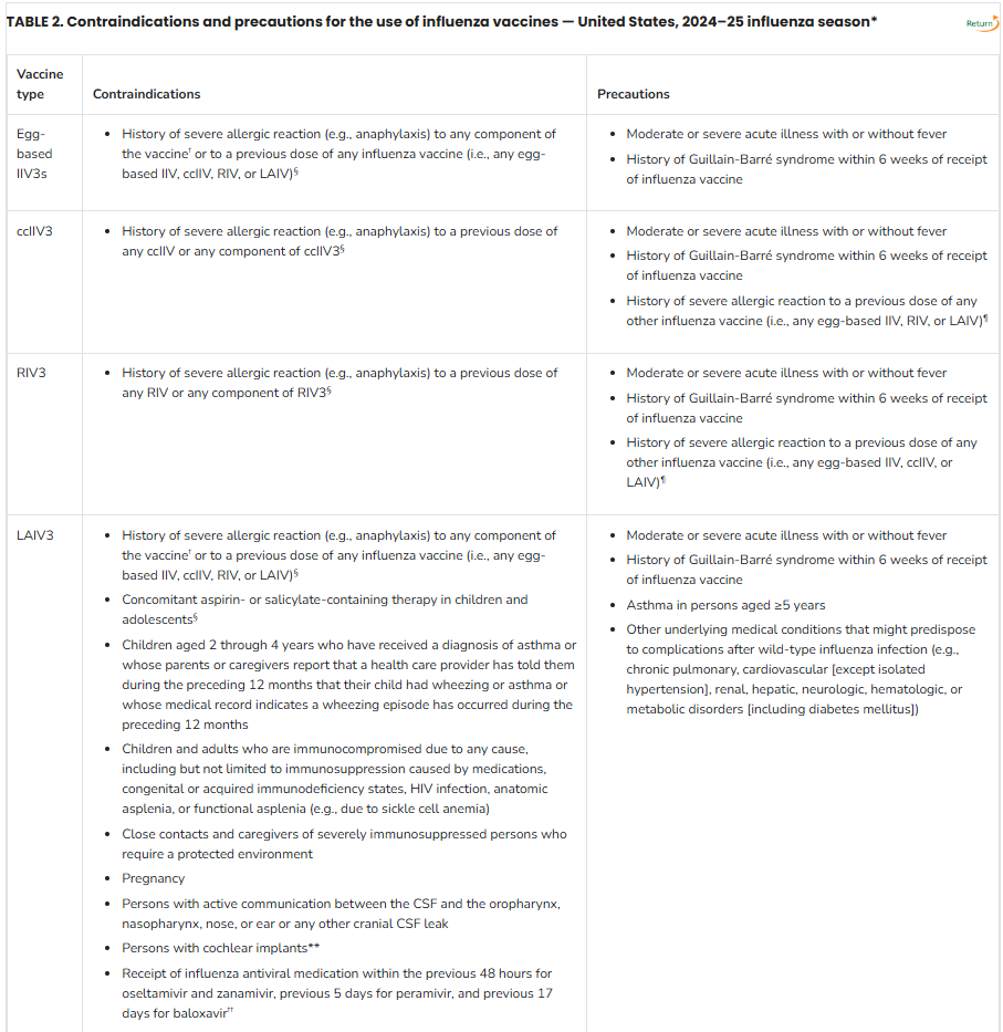 * Manufacturer package inserts and updated CDC and ACIP guidance should be consulted for additional information concerning, but not limited to, indications, contraindications, warnings, and precautions. When a contraindication is present, a vaccine should not be administered. When a precaution is present, vaccination should generally be deferred but might be indicated if the benefit of protection from the vaccine outweighs the risk for an adverse reaction (see the General Best Practice Guidelines for Immunization, available at https://www.cdc.gov/vaccines/hcp/acip-recs/general-recs/index.html). Package inserts for U.S.-licensed vaccines are available at https://www.fda.gov/vaccines-blood-biologics/vaccines/vaccines-licensed-use-united-states.